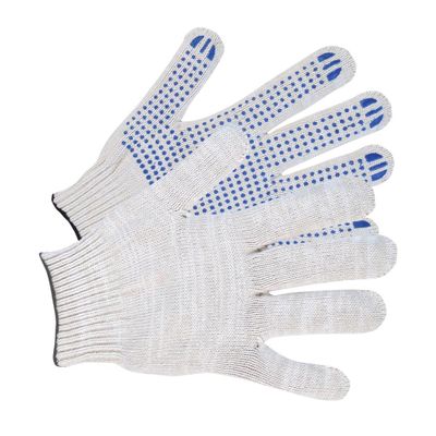 10 класс вязки, 6 нитей. ПВХ покрытие ладони в виде точки. Перчатки предназначены для выполнения работ с нагрузками выше среднего. Вес 56-58гр.